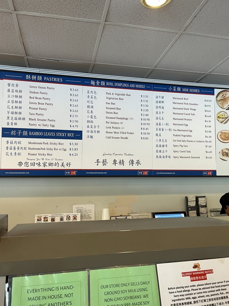 Four Sea Restaurant, located in San Gabriel, CA, offers a variety of delicious Taiwanese breakfast and brunch options. With a focus on buns, dumplings, noodles, signature sandwiches, and rice rolls, this casual spot provides a unique dining experience. The menu includes items like the Brown Sugar Bun, Cold Noodle, Deep Fried Cruller, Salty Rice Roll, and more. Customers rave about the convenience, great selection, and tasty dishes offered at Four Sea Restaurant. The cozy atmosphere and friendly service make it a great place to enjoy traditional Taiwanese cuisine. Whether you're looking for a quick bite or a leisurely meal, Four Sea Restaurant is a must-visit spot for authentic and satisfying Chinese breakfast and brunch.